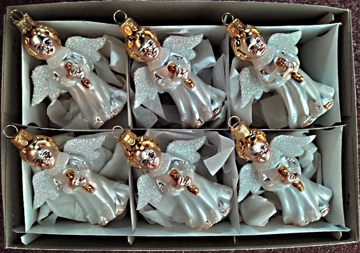 Skleněná vánoční ozdoba, forma, anděl s flétnou a s křídly, mat, barva bílá, dekor, velikost 10x4,8 cm + křídla. Foto ilustrační