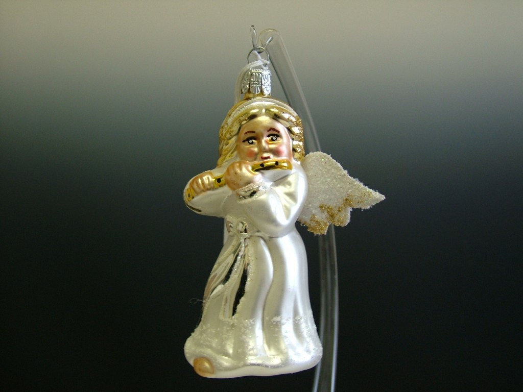 Skleněná vánoční ozdoba, forma, anděl s flétnou velký, mat, bílý, dekor, velikost 10x6 cm + křídla. Foto ilustrační