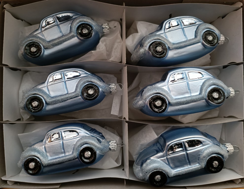 Skleněná vánoční ozdoba, forma, auto Brouk, mat, světle modré, dekor, velikost 11x5 cm. U varianty balení G1/1 ks je cena včetně dárkové krabičky. Foto ilustrační