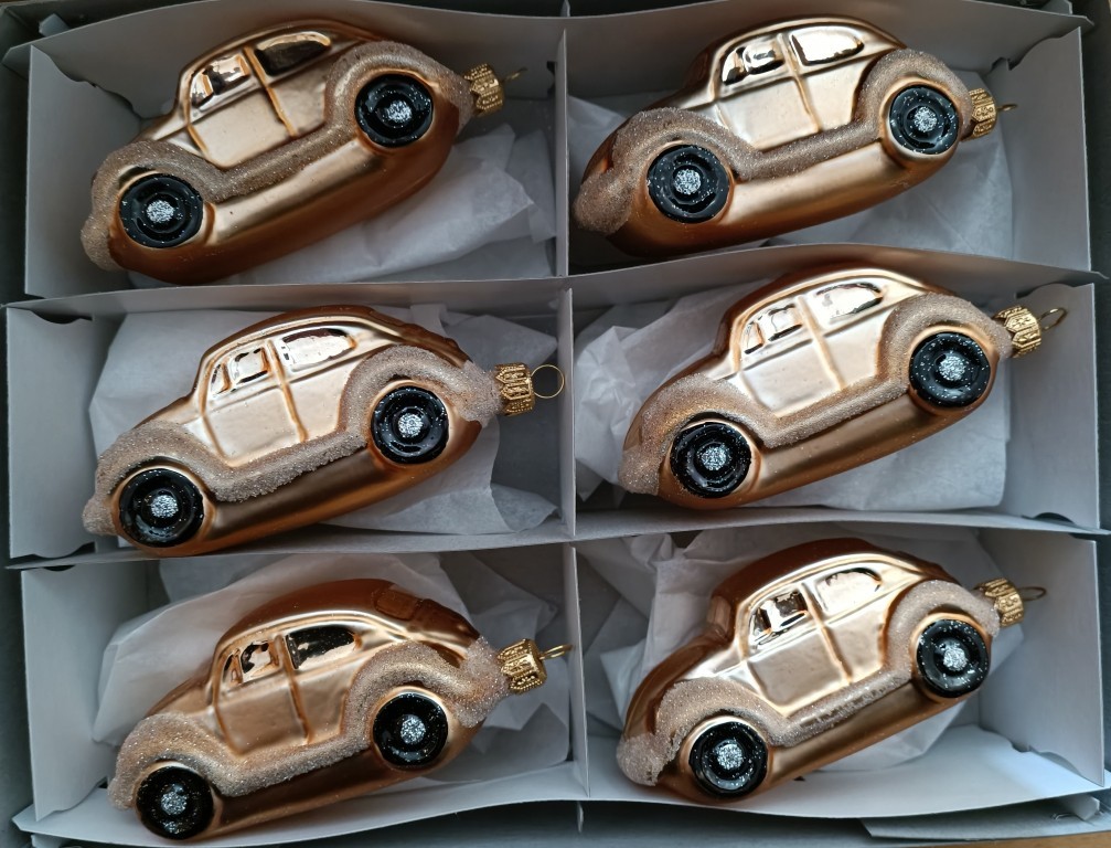 +420 731 683 257vanocniozdoby@slezska-tvorba.czSkleněná vánoční ozdoba, forma, auto Brouk, mat, zlaté, dekor, velikost 11x5 cm. U varianty balení G1/1 ks je cena včetně dárkové krabičky. Foto ilustrační