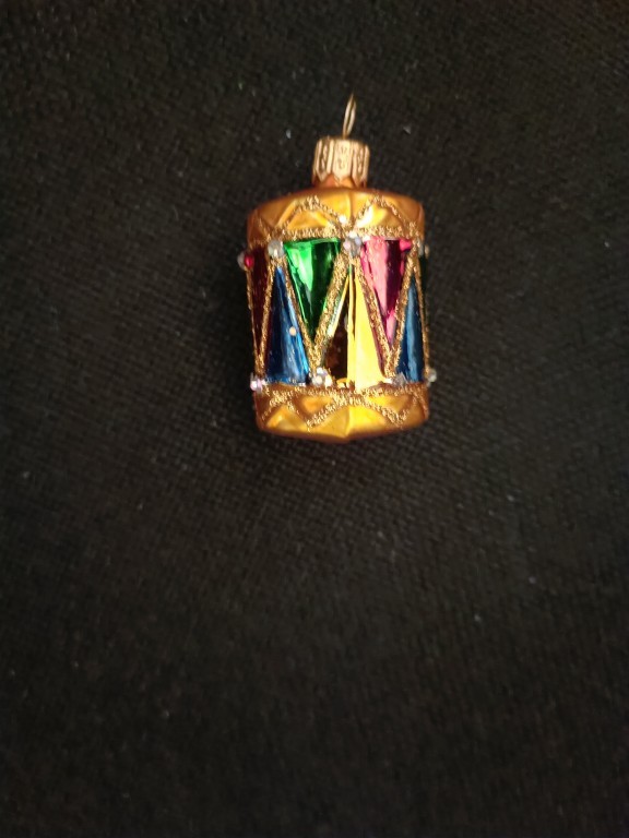 Skleněná ozdoba, forma, ručně zdobená, bubínek, lesk/mat, velikost 5 cm. Foto ilustrační, dekor a barva na figurce se může lišit