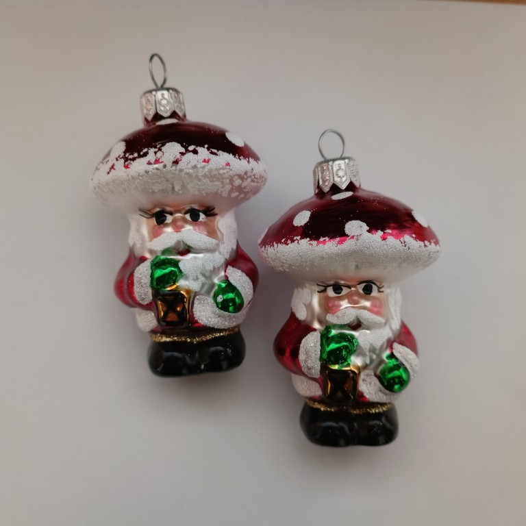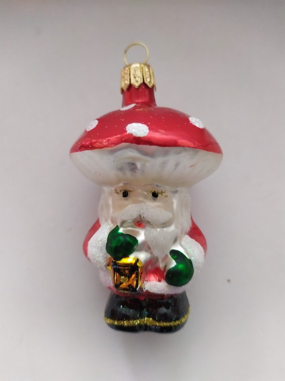 Skleněná vánoční ozdoba ve tvaru dědečka hříbečka, forma, stříbřená, barva ass, lesk/mat, velikost 8,5 cm, baleno po 1 kuse v PET krabičce, dekor dle skladových zásob, foto ilustrační.