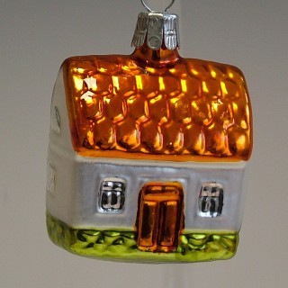 Skleněná vánoční ozdoba, domek malý, forma, mat, barevný dekor, oranžová střecha/213, velikost 4x6 cm. Foto ilustrační
