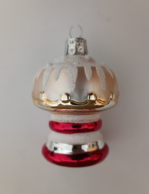 Skleněná vánoční ozdoba, forma, dort na červeném podstavci, lesk/mat, barevný dekor, foto ilustrační