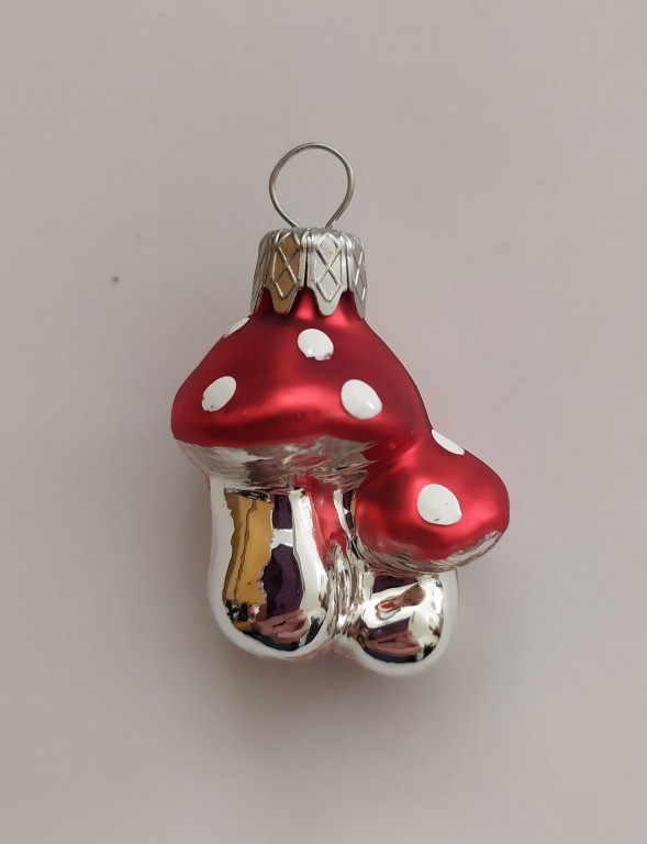 +420 731 683 257vanocniozdoby@slezska-tvorba.czSkleněná ozdoba, forma, barevný dekor, dvě houby se stříbrnou nožkou, mat, velikost 4 cm. Foto ilustrační, dekor a barva na figurce se může lišit