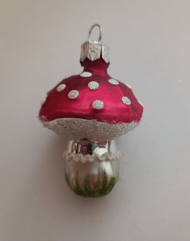 Skleněná ozdoba, forma, ručně zdobená, houba větší, mat/lesk, velikost 6 cm. Foto ilustrační, dekor a barva na figurce se může lišit.
