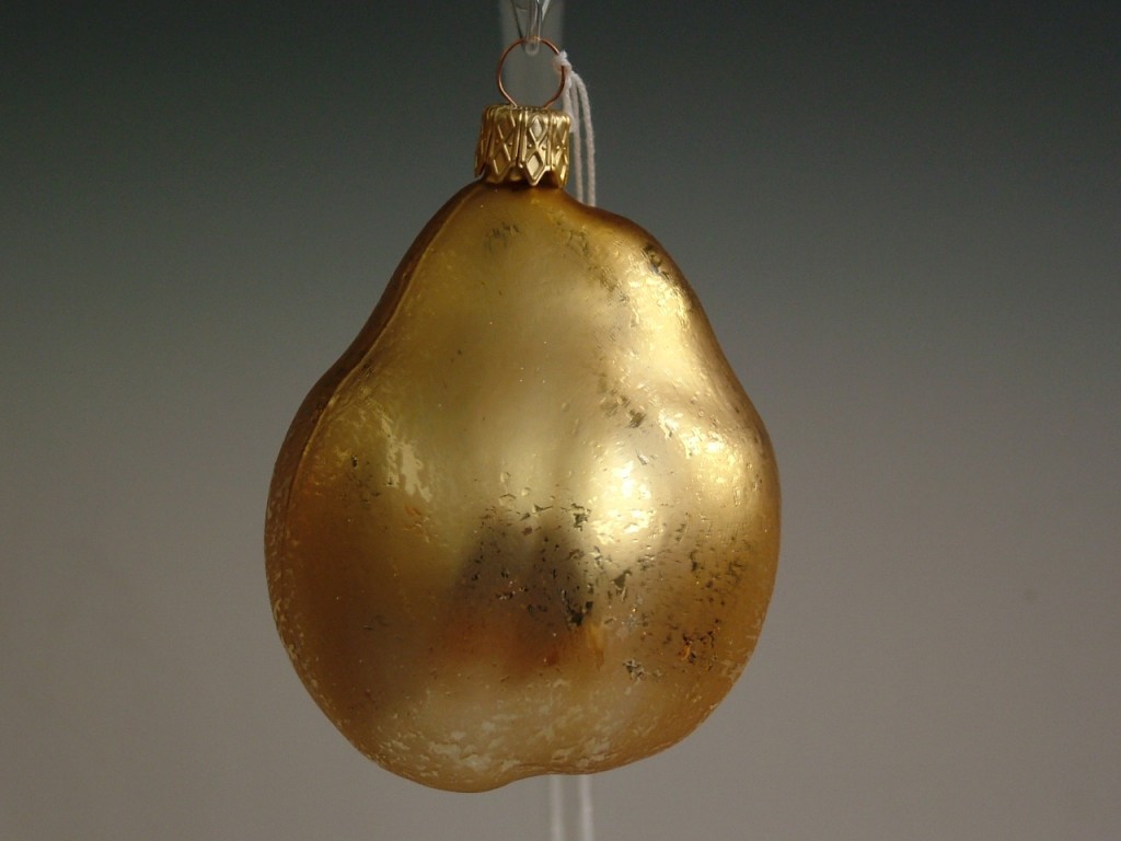 Skleněná vánoční ozdoba, forma, hruška velká, barva zlatá, mat, dekor. Foto ilustrační