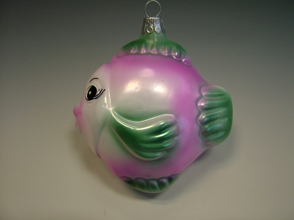 Skleněná vánoční ozdoba, forma, kapr veliký, porcelán, stříkaný, barevný, dekor, velikost 8x10 cm. Foto ilustrační