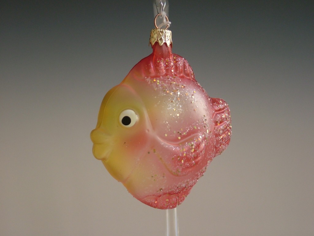 Skleněná vánoční ozdoba, forma, kapr veliký, průhledný, barevný, lesk, dekor, velikost 8x10 cm. Foto ilustrační