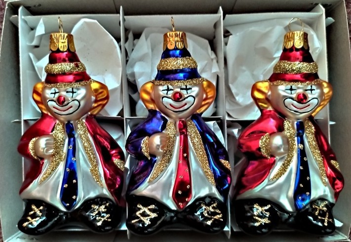 +420 731 683 257vanocniozdoby@slezska-tvorba.czSkleněná vánoční ozdoba, forma, klaun s kloboukem, lesk/mat, dekor, barva ass, velikost 11x6 cm, v balení klaun ve 2 variantách (červené + modré sako),foto ilustrační.