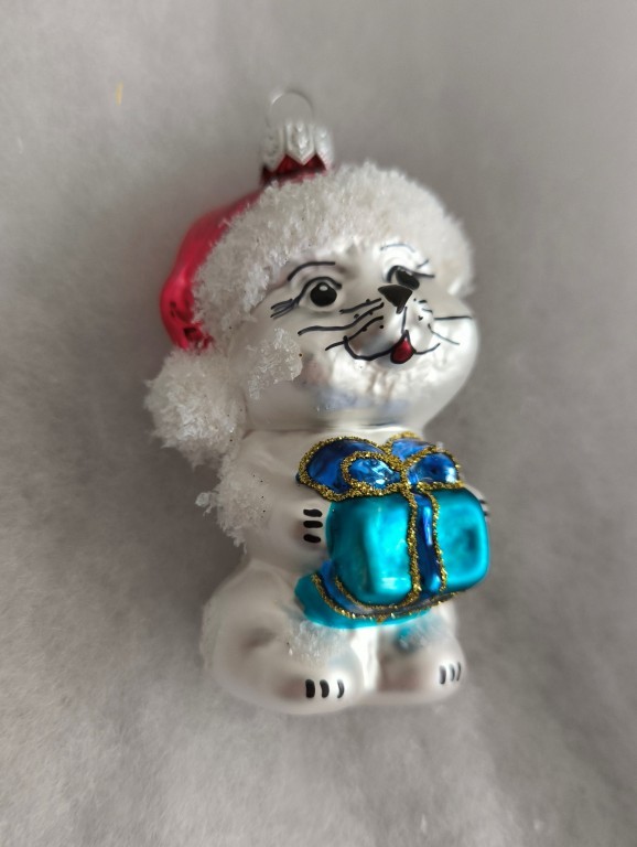 Skleněná ozdoba, forma, ručně zdobená, kočka s dárkem, bílá, velikost 9,5 cm, lesk/mat, foto ilustrační, barevný dekor