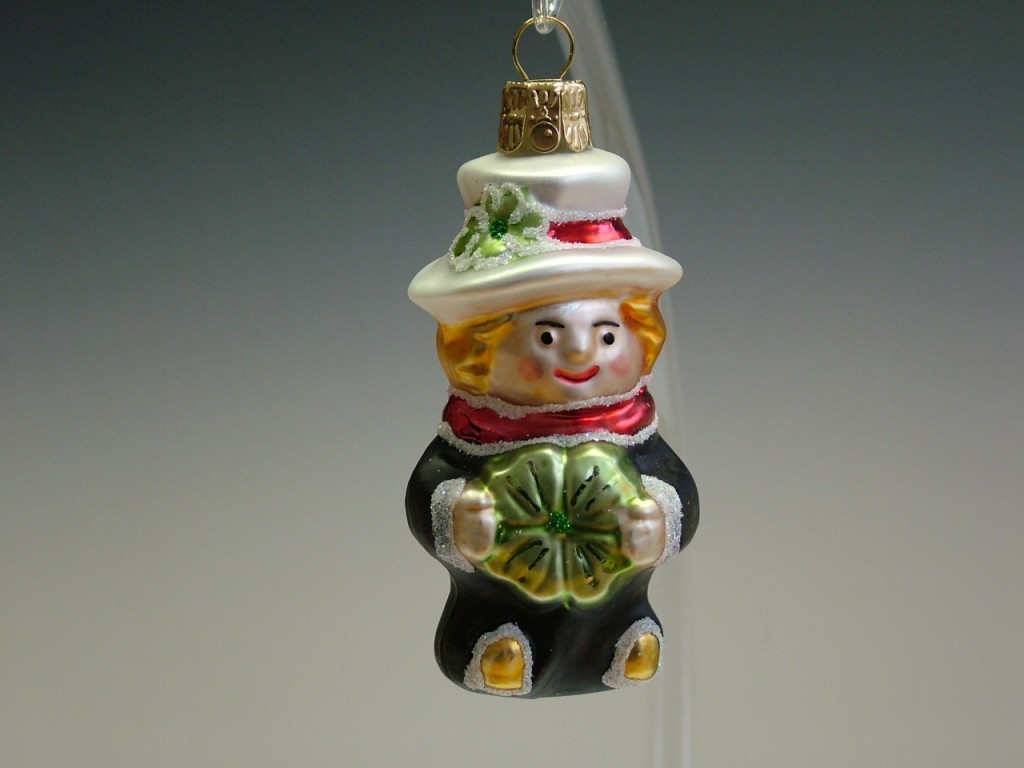 Skleněná vánoční ozdoba, forma, kominík s čtyřlístkem, bílý klobouk, lesk, barevná, dekor, velikost 8x4 cm. Foto ilustrační