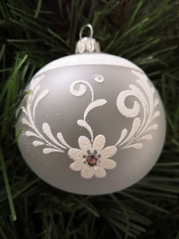 +420 731 683 257vanocniozdoby@slezska-tvorba.czSkleněná vánoční ozdoba ve tvaru koule, hladká, průhledná, bílá, mat, bílý dekor, šaton. Foto ilustrační