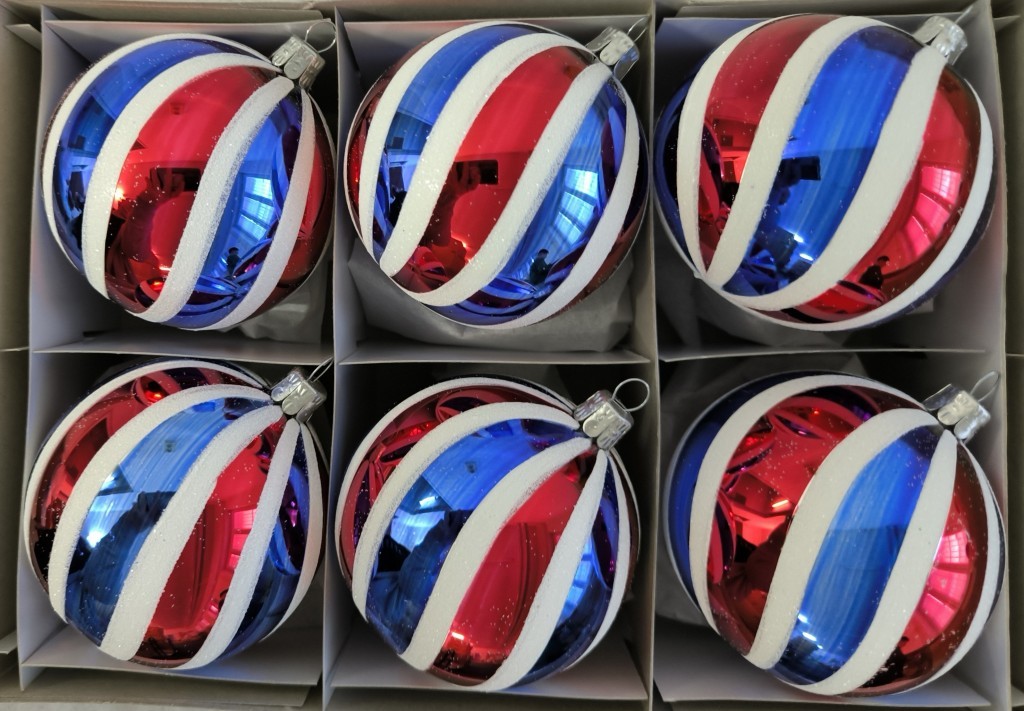 Skleněná vánoční ozdoba ve tvaru koule, hladká, červeno-modrý ručně malovaný retro dekor, lesk, více velikostí. Foto ilustrační.