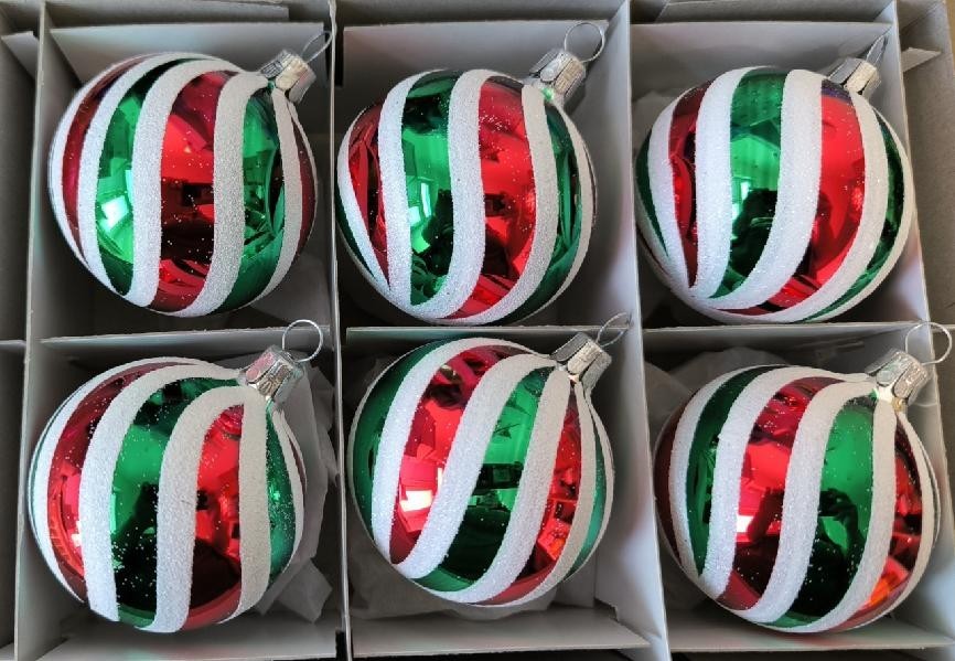 +420 731 683 257vanocniozdoby@slezska-tvorba.czSkleněná vánoční ozdoba ve tvaru koule, hladká, červeno-zelený ručně malovaný retro dekor, lesk, více velikostí. Foto ilustrační.