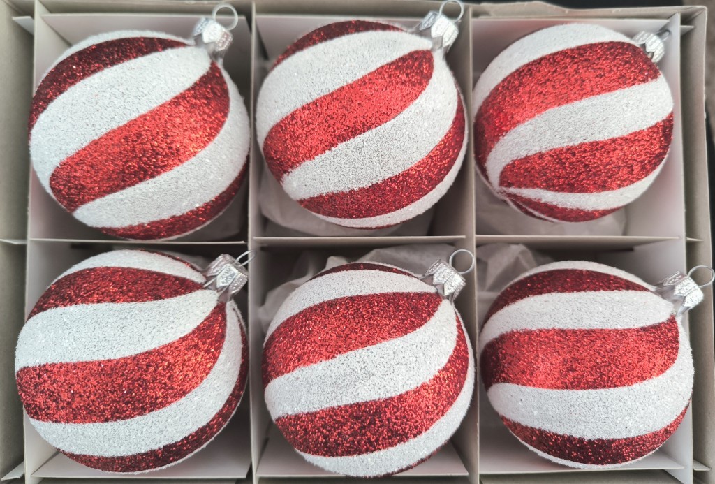 Skleněná ozdoba ve tvaru koule, hladká, čirá, sypaný barevný dekor, foto ilustrační.