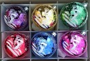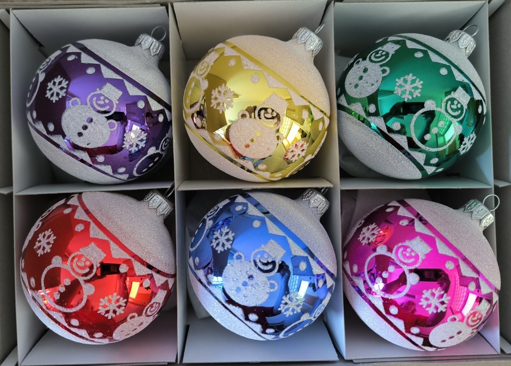 Skleněná vánoční ozdoba ve tvaru koule, hladká, barva ass, lesk, bílý dekor sněhuláka, 2 varianty dekoru (1. varianta bez talířů dole a nahoře, 2. varianta s talíři dole a nahoře),velikost 8 cm. Foto ilustrační. V krabici sortiment barev: červená, modrá, žlutá, zelená, růžová, fialová.