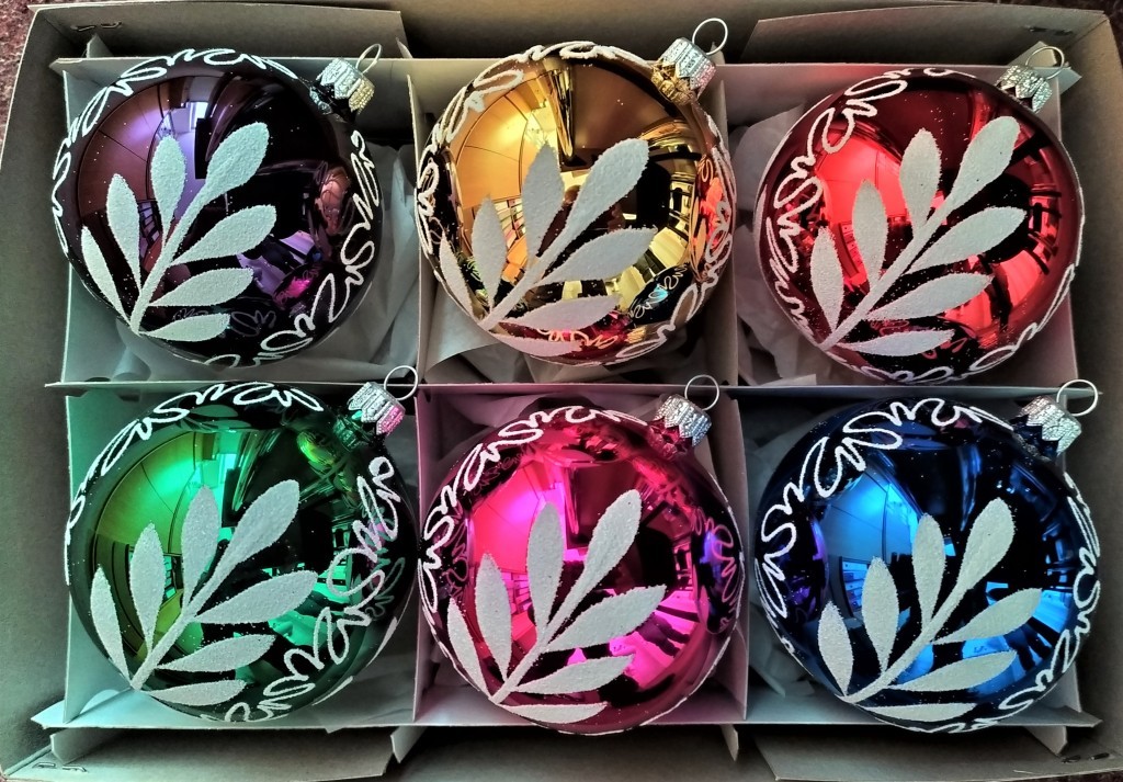 Skleněná vánoční ozdoba ve tvaru koule, hladká, barva ass, lesk, bílý dekor, průměr koule 8 cm. Foto ilustrační. V krabici sortiment barev: červená, modrá, žlutá, zelená, růžová, fialová.