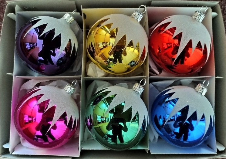+420 731 683 257vanocniozdoby@slezska-tvorba.czSkleněná vánoční ozdoba ve tvaru koule, hladká, barva ass, lesk, bílý dekor, více velikostí, foto ilustrační, (sortiment barev: červená, modrá, žlutá, zelená, růžová, fialová.)