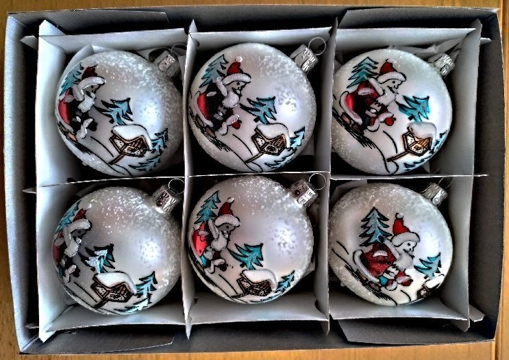 +420 731 683 257vanocniozdoby@slezska-tvorba.czSkleněná vánoční ozdoba ve tvaru koule, hladká, bílá, mat, barevný dekor. Foto ilustrační