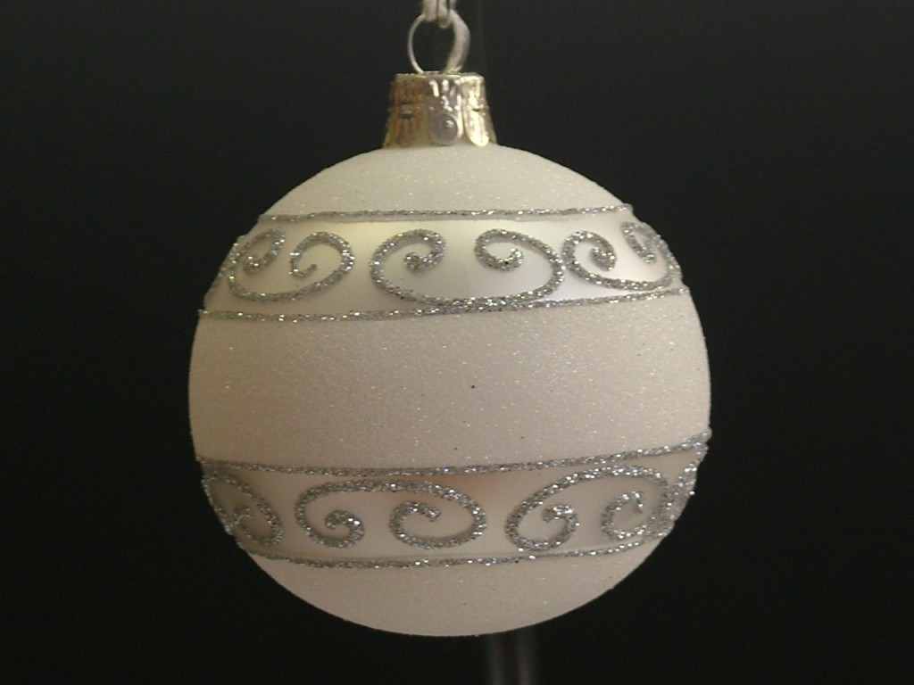 +420 731 683 257vanocniozdoby@slezska-tvorba.czSkleněná vánoční ozdoba ve tvaru koule, hladká, bílá, mat, bílý plastický dekor, více velikostí. Foto ilustrační