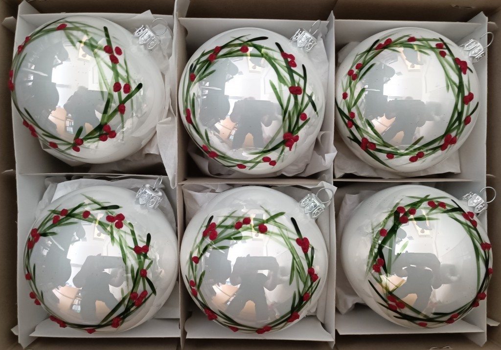 +420 731 683 257vanocniozdoby@slezska-tvorba.czSkleněná vánoční ozdoba ve tvaru koule, hladká, bílá, porcelán, malovaný barevný dekor/věneček, foto ilustrační