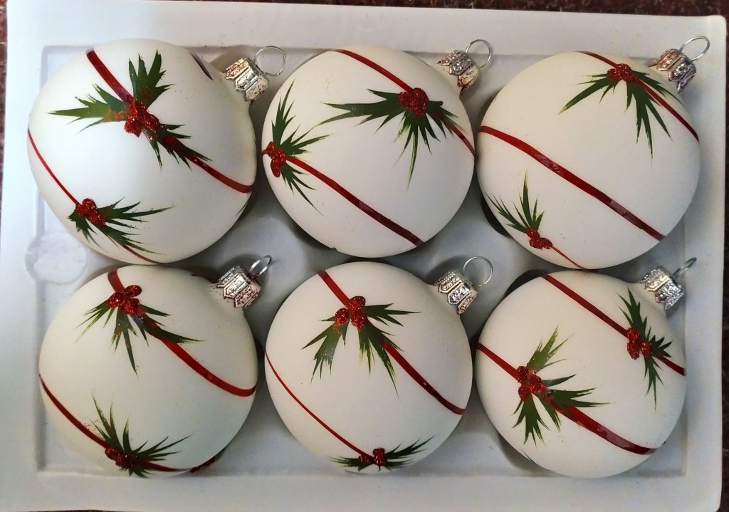 +420 731 683 257vanocniozdoby@slezska-tvorba.czSkleněná vánoční ozdoba ve tvaru koule, hladká, bílý mat/skořápka, malovaný plast. zelenočervený dekor, více velikostí, Foto ilustrační