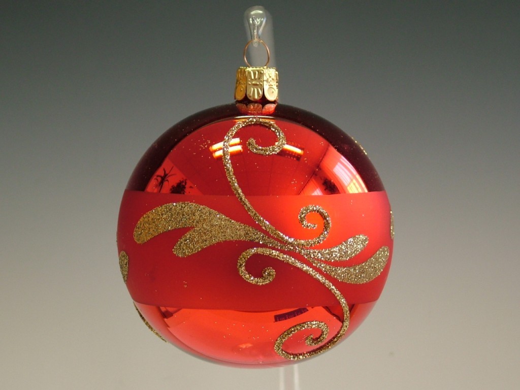 +420 731 683 257vanocniozdoby@slezska-tvorba.czSkleněná vánoční ozdoba ve tvaru koule, hladká, červený lesk, plast. zlatý dekor, více velikostí. Foto ilustrační
