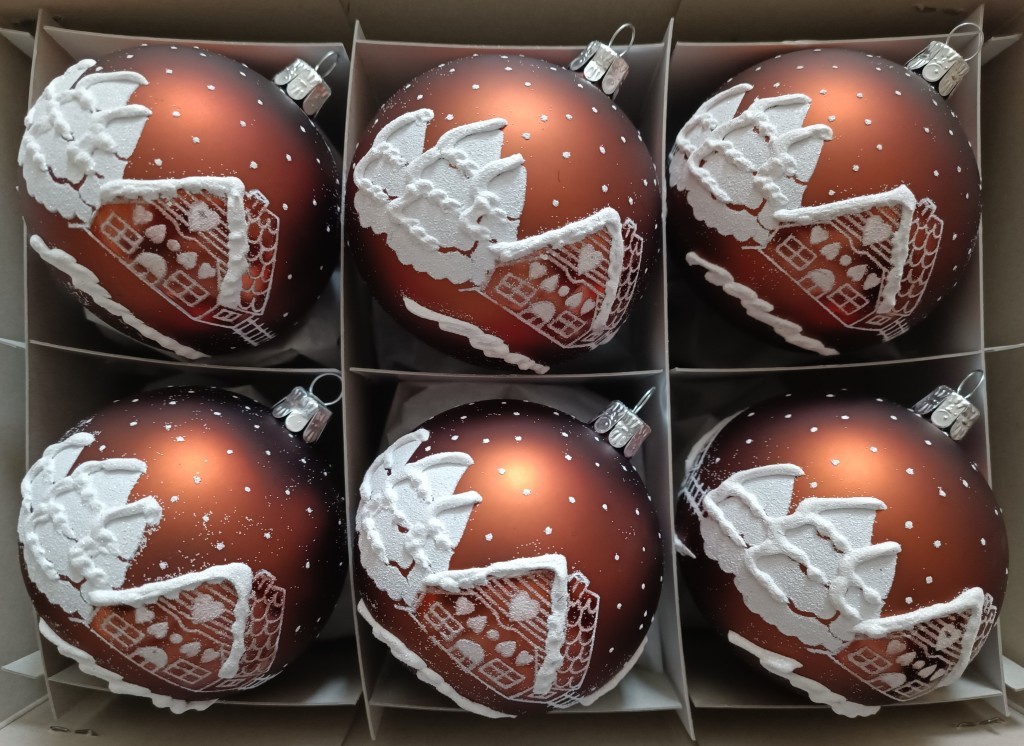 +420 731 683 257vanocniozdoby@slezska-tvorba.czSkleněná vánoční ozdoba ve tvaru koule, hladká, hnědý mat, bílý plastický dekor. Foto ilustrační,