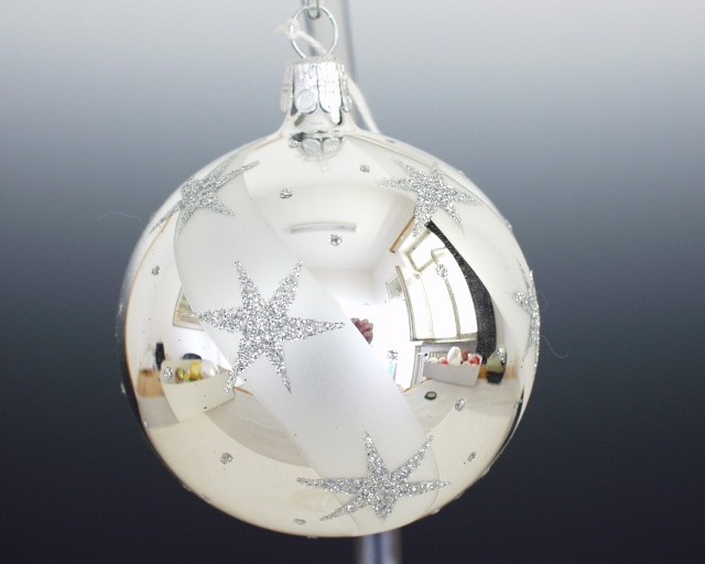 Skleněná vánoční ozdoba ve tvaru koule, hladká, stříbrná, lesk, matný bílý dekor se stříbrnými hvězdami, více velikostí. Foto ilustrační