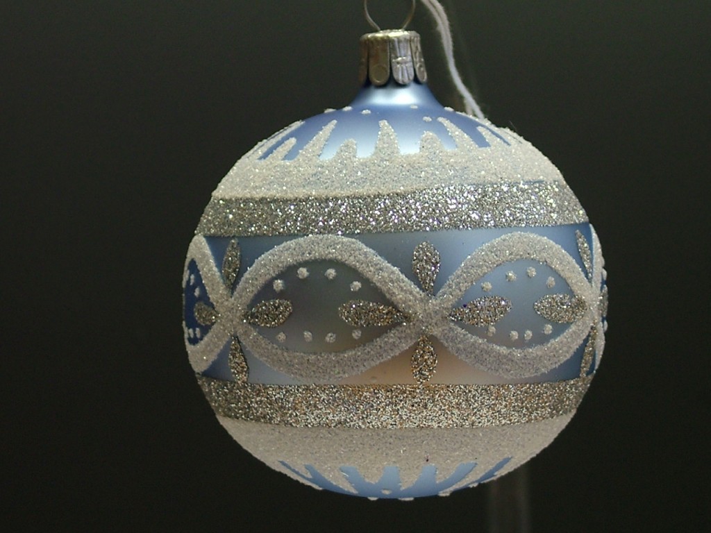 Skleněná vánoční ozdoba ve tvaru koule, hladká, světle modrá, mat, malovaná, dekor. Foto ilustrační