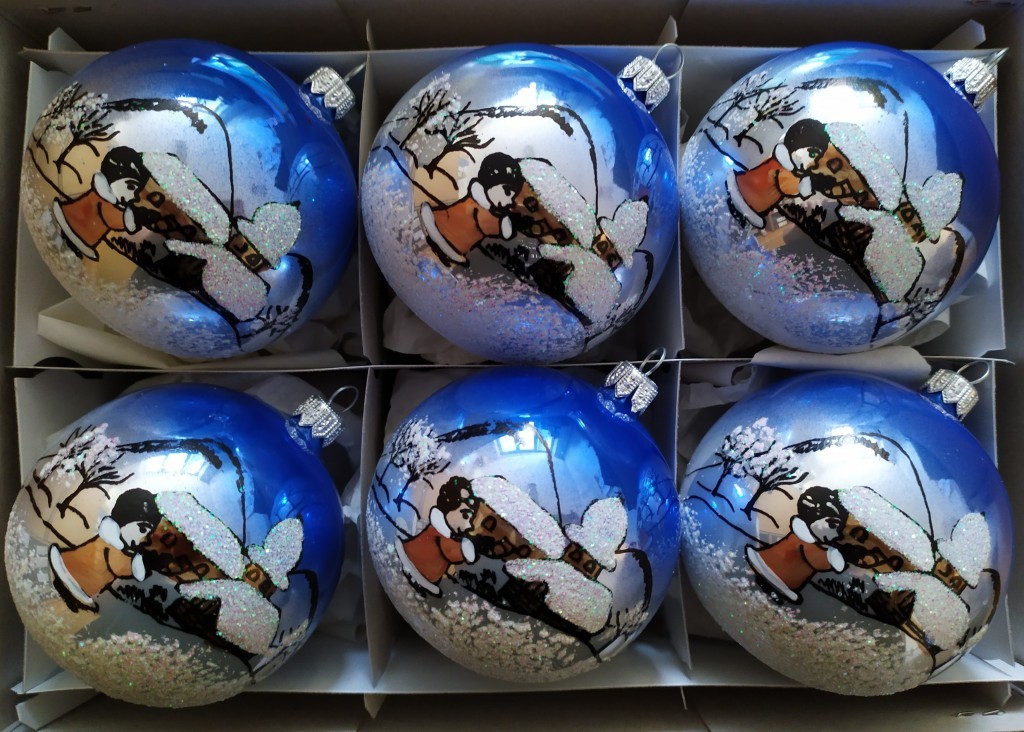 Skleněná vánoční ozdoba ve tvaru koule, hladká, porcelán, modrý dekor, motiv ponocného na návsi. Foto ilustrační
