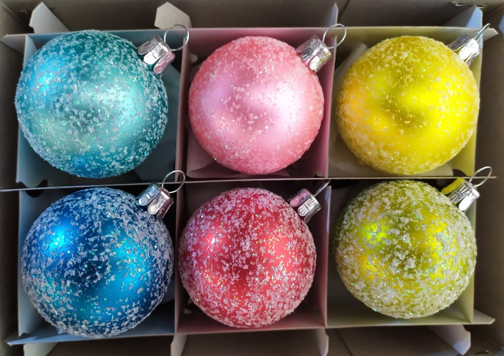 Skleněná vánoční ozdoba ve tvaru koule, hladká, sortiment barev, mat, dekor hubkovaný bílou diamantinou, velikost 5 cm. Foto ilustrační.