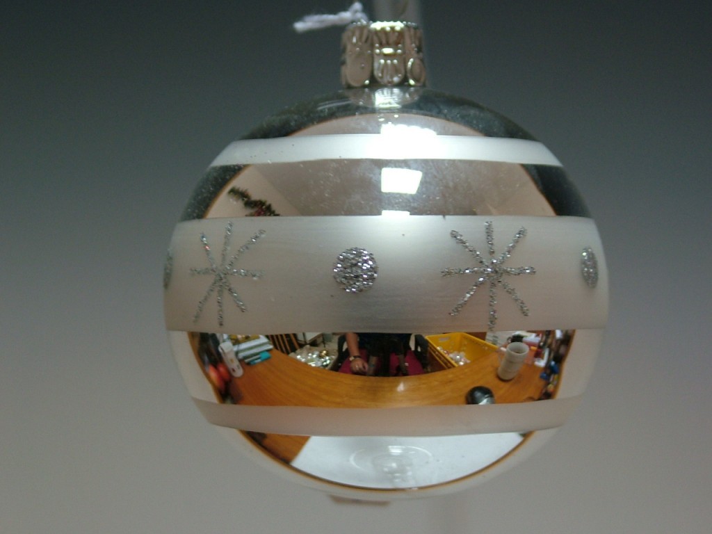Skleněná vánoční ozdoba ve tvaru koule, hladká, stříbrná, střed bílým matem, dekor, více velikostí. Foto ilustrační