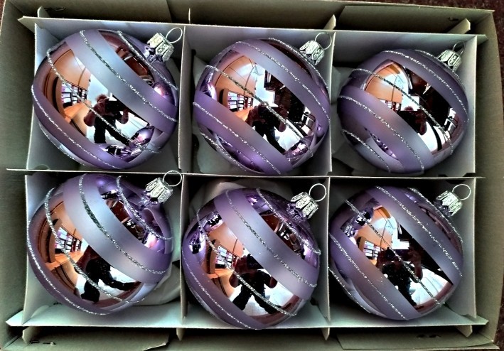 Skleněná vánoční ozdoba ve tvaru koule, hladká, světle fialový lesk, plast. dekor, více velikostí. Foto ilustrační