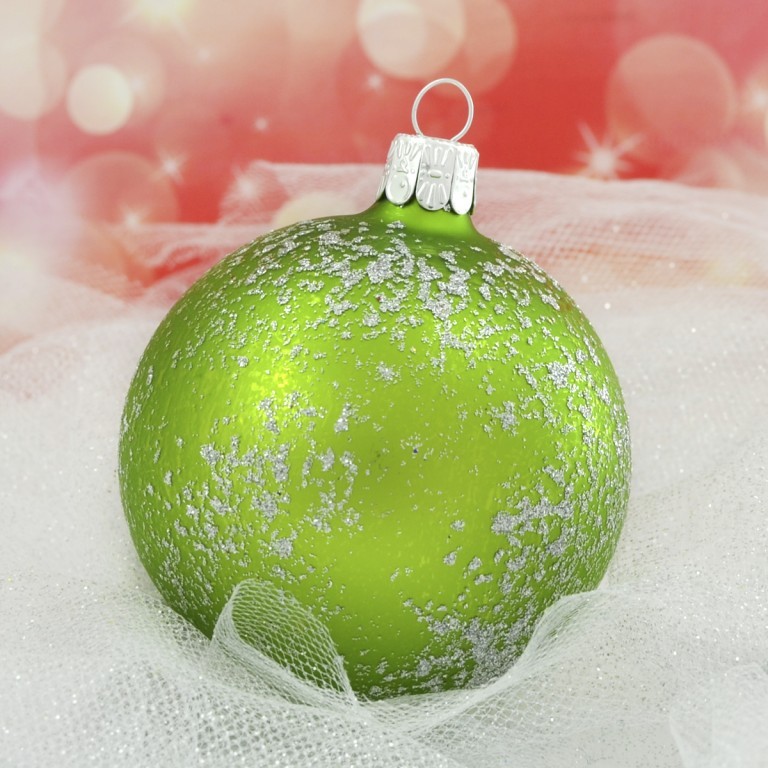 Skleněná vánoční ozdoba ve tvaru koule, hladká, světle zelená, mat, hubkovaná lakem, stříbrná diamantina, více velikostí. Foto ilustrační
