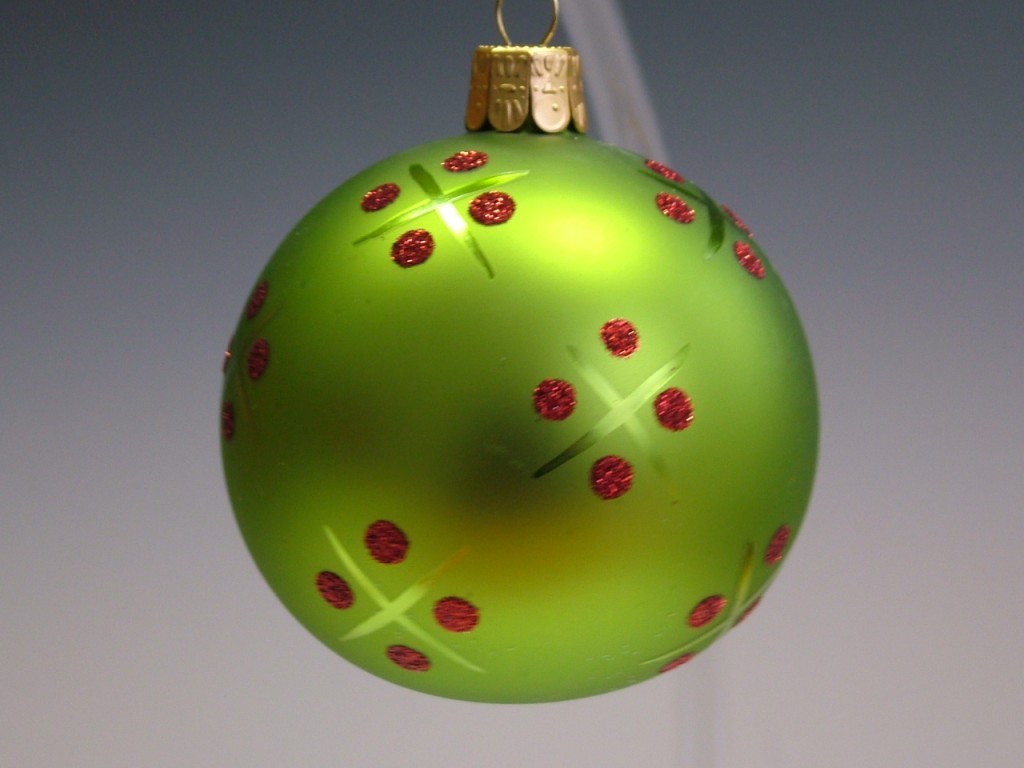 Skleněná vánoční ozdoba ve tvaru koule, hladká, zelený mat, červený dekor. Foto ilustrační.