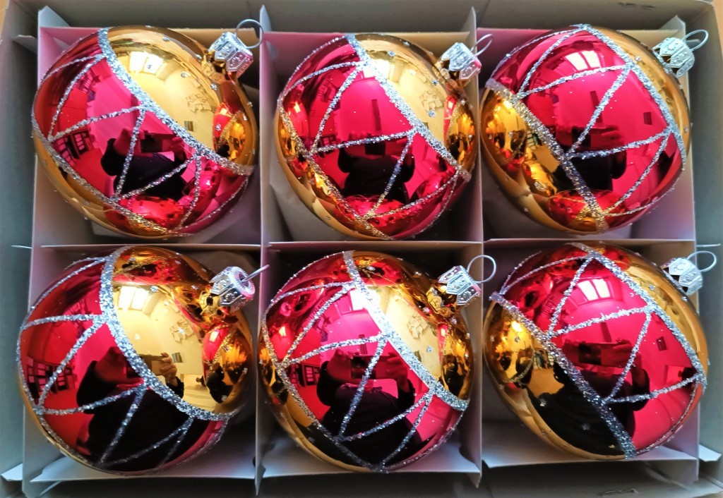 Skleněná vánoční ozdoba ve tvaru koule, hladká, zlatá,lesk, červený dekor. Foto ilustrační