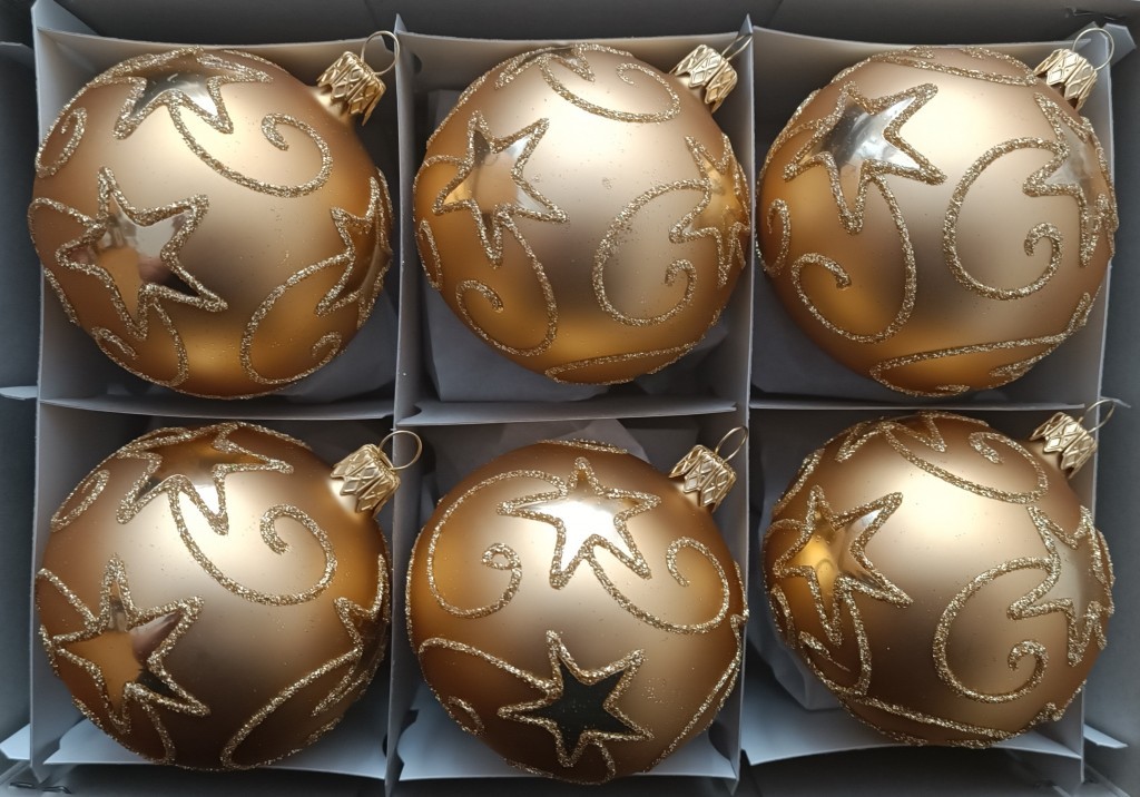 Skleněná vánoční ozdoba ve tvaru koule, hladká, zlatý mat, plastický dekor hvězd, více velikostí. Foto ilustrační