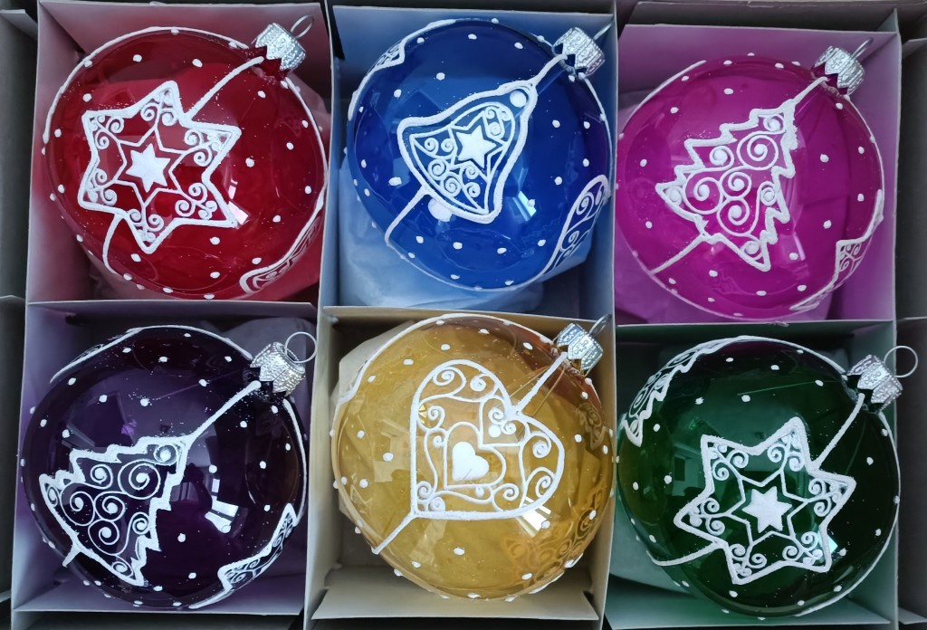 Skleněná vánoční ozdoba ve tvaru koule, hladká, průhledná, lesk, barva ass, bílý plastický dekor. Foto ilustrační.