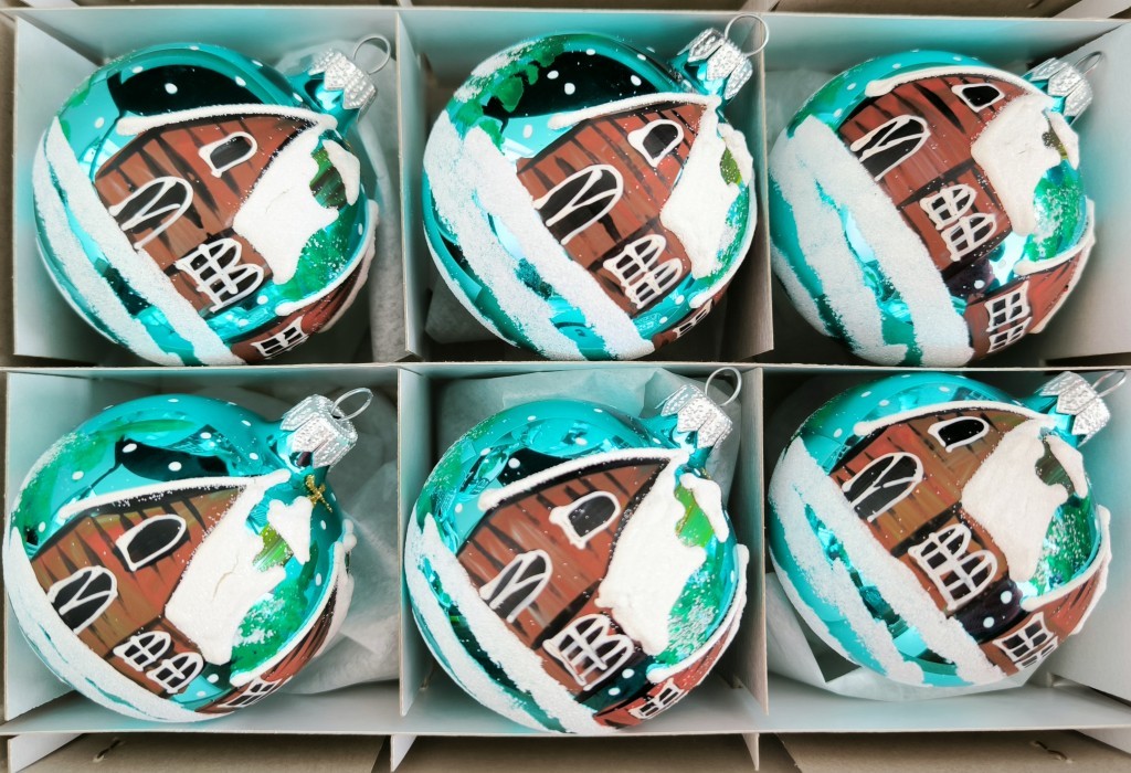 Skleněná vánoční ozdoba ve tvaru koule, hladká, tyrkys lesk, ručně malovaný plastický zimní dekor s domky, více velikostí. Foto ilustrační