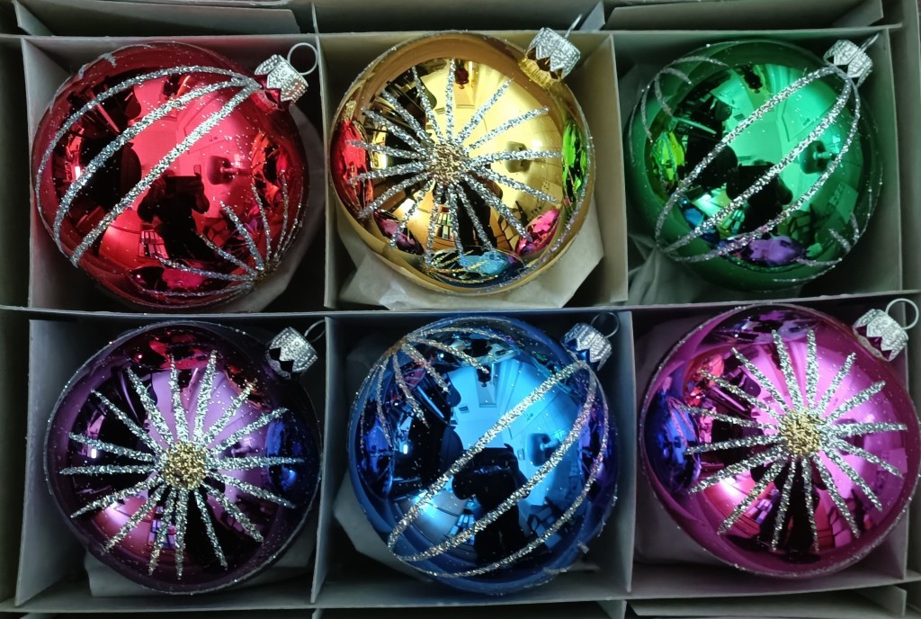 Skleněná vánoční ozdoba ve tvaru koule, hladká, barva ass, lesk, dekor, foto ilustrační.