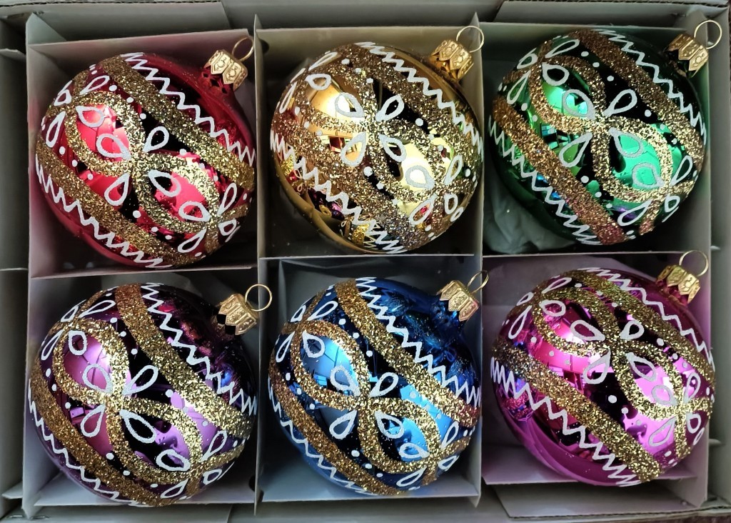 +420 731 683 257vanocniozdoby@slezska-tvorba.czSkleněná vánoční ozdoba ve tvaru koule, hladká, stříbřená, barva ass lesk, ručně malovaný zlatý retro dekor/9221, foto ilustrační