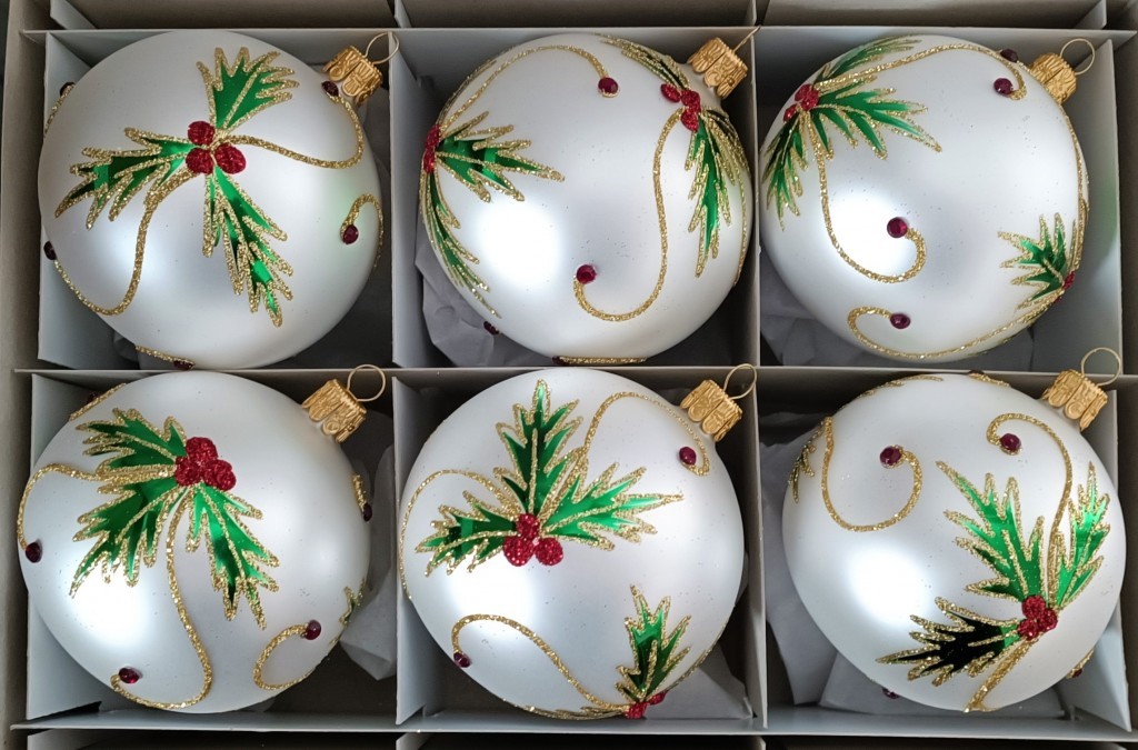 +420 731 683 257vanocniozdoby@slezska-tvorba.czSkleněná vánoční ozdoba ve tvaru koule, hladká, bílá, mat, ručně malovaný barevný plastický dekor se šatony, více velikostí. Foto ilustrační