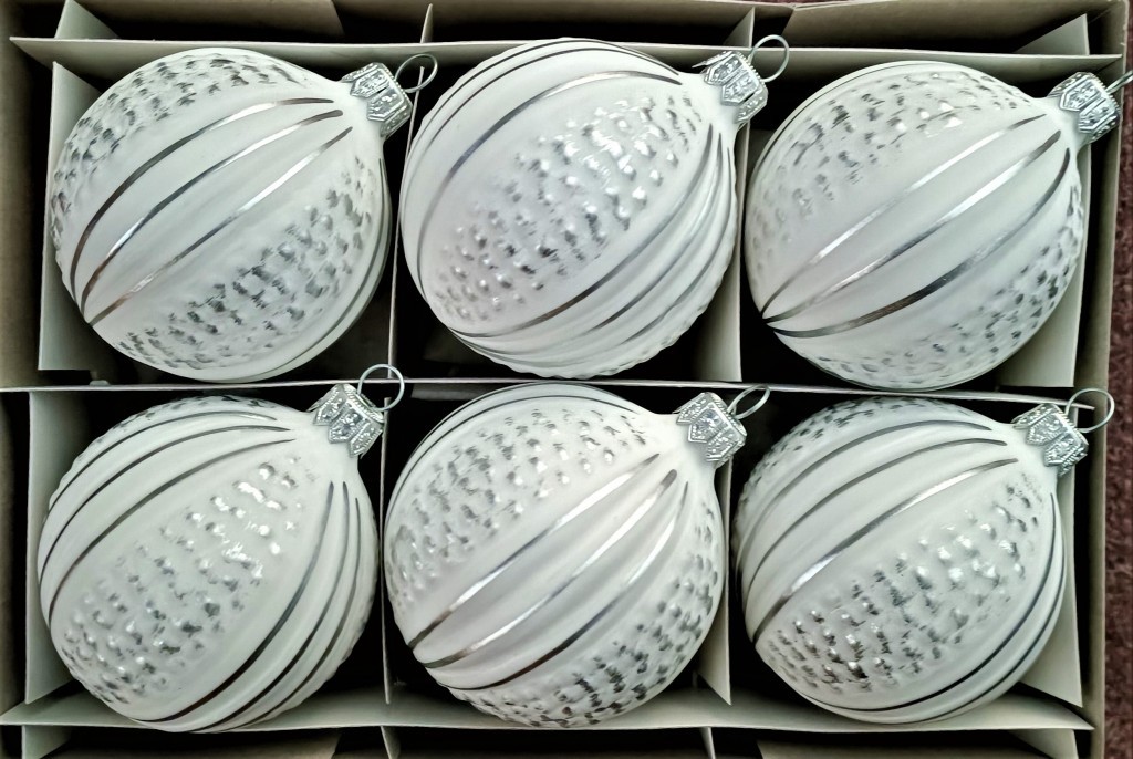 Skleněná vánoční ozdoba ve tvaru koule, forma, bílá skořápka, ručně malovaný stříbrný dekor. Foto ilustrační
