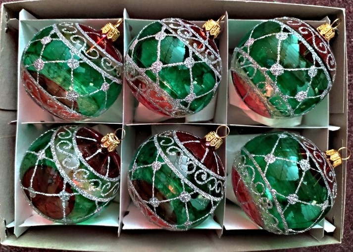 Skleněná vánoční ozdoba ve tvaru koule, hladká, průhledná, barevná, lesk, bohatý dekor, foto ilustrační.