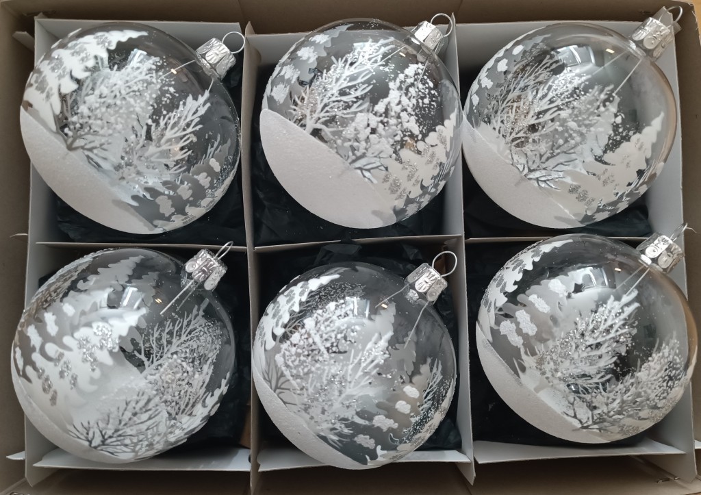 +420 731 683 257vanocniozdoby@slezska-tvorba.czSkleněná vánoční ozdoba ve tvaru koule, hladká, čirá, lesk, bílostříbrný dekor stromů, více velikostí. Foto ilustrační