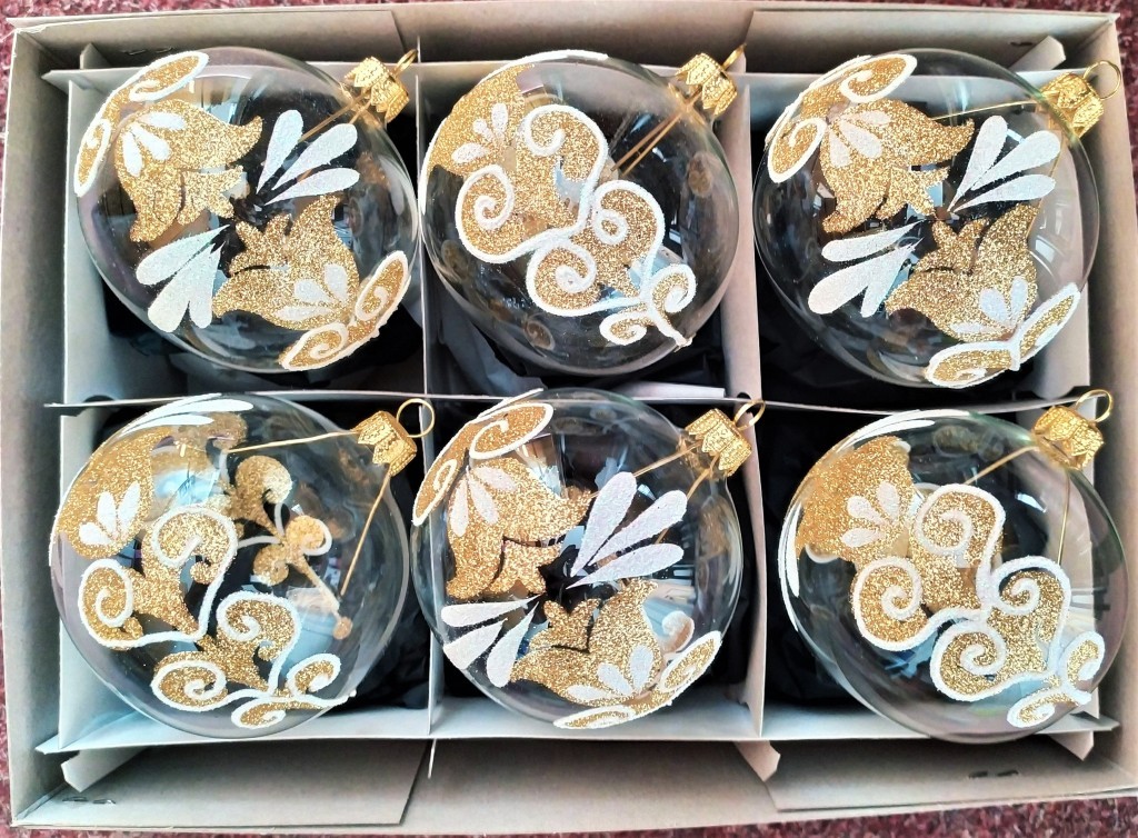Skleněná vánoční ozdoba ve tvaru koule, hladká, čirá, lesk, zlatobílý dekor, motiv tulipánů se stonky. Foto ilustrační.