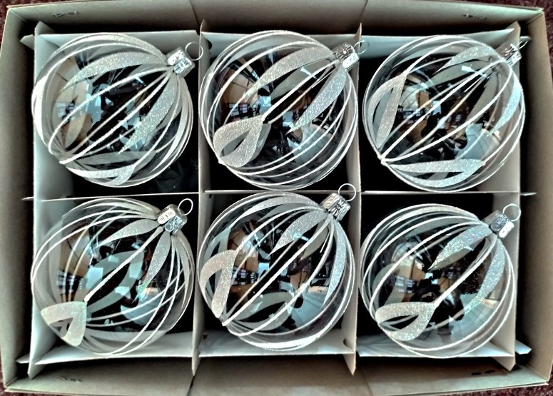 Skleněná vánoční ozdoba ve tvaru koule, hladká, čirá, lesk, bílý dekor. Foto ilustrační.