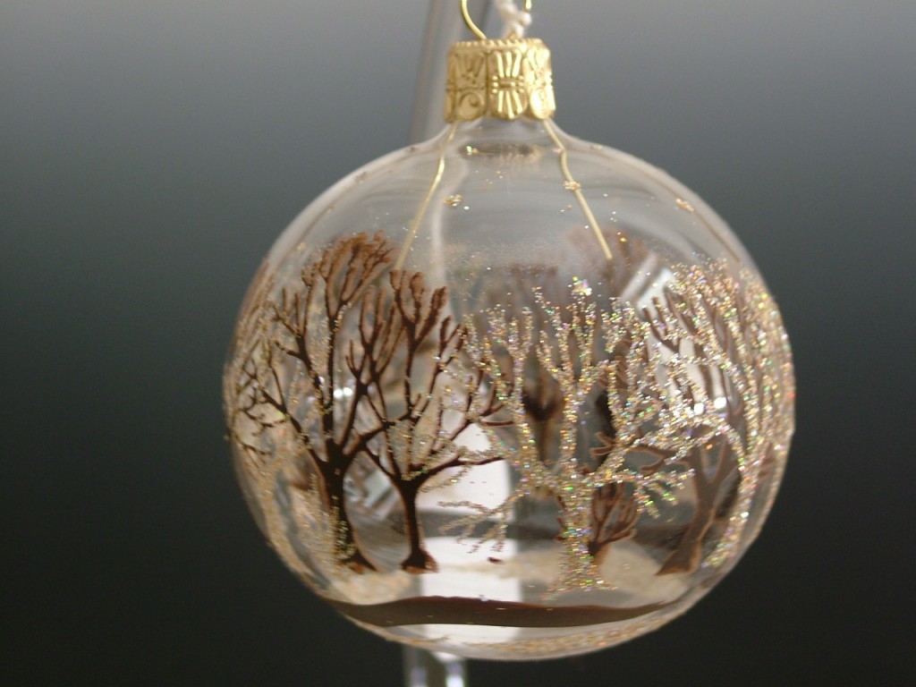 +420 731 683 257vanocniozdoby@slezska-tvorba.czSkleněná vánoční ozdoba ve tvaru koule, hladká, čirá, lesk, hnědozlatý dekor stromů. Foto ilustrační.